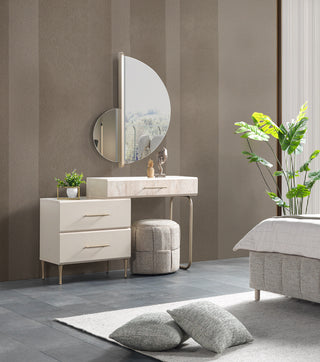 Bodrum Yatak Odası Takımı, yatak odanızda hem şıklığı hem de işlevselliği bir araya getirir. Mat aytaşı-meşe renkleri, doğal dokular ve vintage esintilerle tasarlanan bu takım, odanıza sıcak bir atmosfer katar.